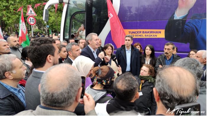 DEM Parti Eş Genel Başkanı Tuncer Bakırhan Fatih istikametine park etmiş DEM Parti otobüsünün önünde bir konuşma yaptı.