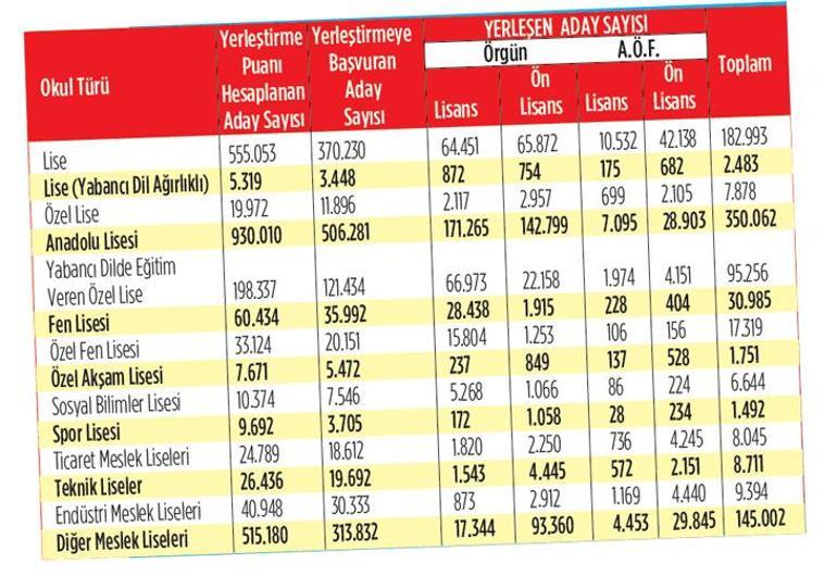 - Endüstri meslek liseleri yüzde 30,9; özel akşam liseleri yüzde 32; ticaret meslek liseleri yüzde 43 ile en düşük yerleştirme oranlarına sahip.