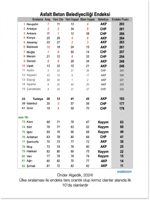 ABB2024’de ikinci olan Antalya araç sahipliğinde 3, yeni otomobil sahipliğinde 2, yapılan inşaatta 34 ve biten inşaatta 8. sırada olunca toplam 281 asfalt-beton belediyeciliği puanı topluyor.