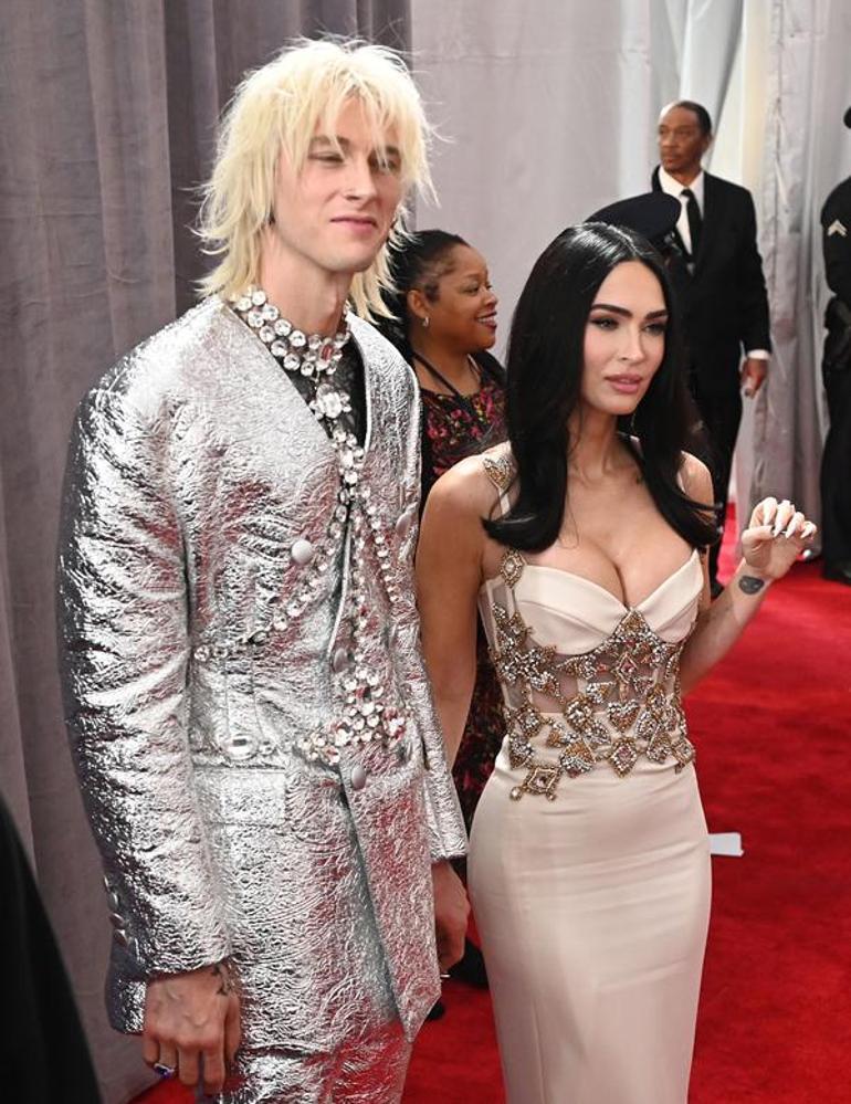 Geceye nişanlısı Machine Gun Kelly ile birlikte katılan Megan Fox, vücudunu saran, taşlarla süslenmiş beyaz elbisesiyle zarif bir görüntü çizdi. Kelly ise baştan aşağı gümüş renginden oluşan bir takım tercih etti.