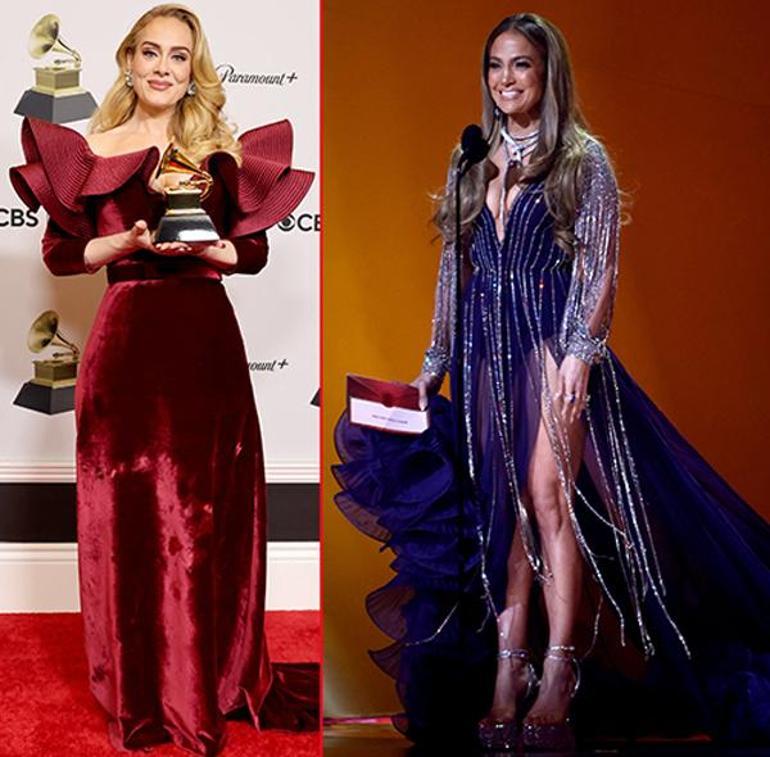 Adele, bordo kadife bir elbise tercih ederken; Jennifer Lopez, gümüş püsküllü ve kollu lacivert elbisesiyle kırmızı halının en beğenilen isimlerden biri oldu.