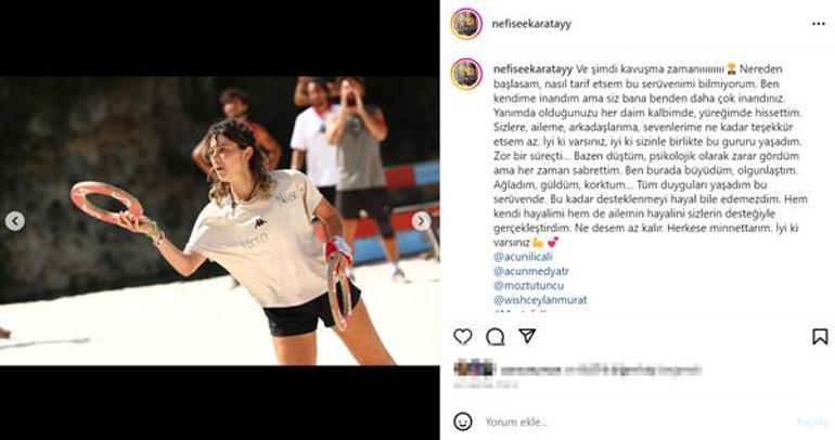 Nefise Karatay da yarışma sonrası Instagram sayfasından yaptığı paylaşımında, yarışmadan karelerine yer vererek altına ''Ve şimdi kavuşma zamanı. Nereden başlasam, nasıl tarif etsem bu serüvenimi bilmiyorum. Ben kendime inandım ama siz bana benden daha çok inandınız. Yanımda olduğunuzu her daim kalbimde, yüreğimde hissettim. Sizlere, aileme, arkadaşlarıma, sevenlerime ne kadar teşekkür etsem az. İyi ki varsınız, iyi ki sizinle birlikte bu gururu yaşadım. Zor bir süreçti. Bazen düştüm, psikolojik olarak zarar gördüm ama her zaman sabrettim. Ben burada büyüdüm, olgunlaştım. Ağladım, güldüm, korktum. Tüm duyguları yaşadım bu serüvende. Bu kadar desteklenmeyi hayal bile edemezdim. Hem kendi hayalimi hem de ailemin hayalini sizlerin desteğiyle gerçekleştirdim. Ne desem az kalır. Herkese minnettarım. İyi ki varsınız'' notunu düştü.