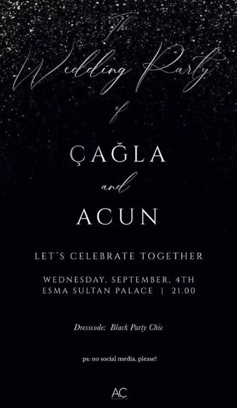 Evlenmek için gün sayan çiftin düğün davetiyesi de ortaya çıktı. Siyah bir davetiye tasarlatan çift, davetlilerden gecede sosyal medya kullanmamalarını rica etti.