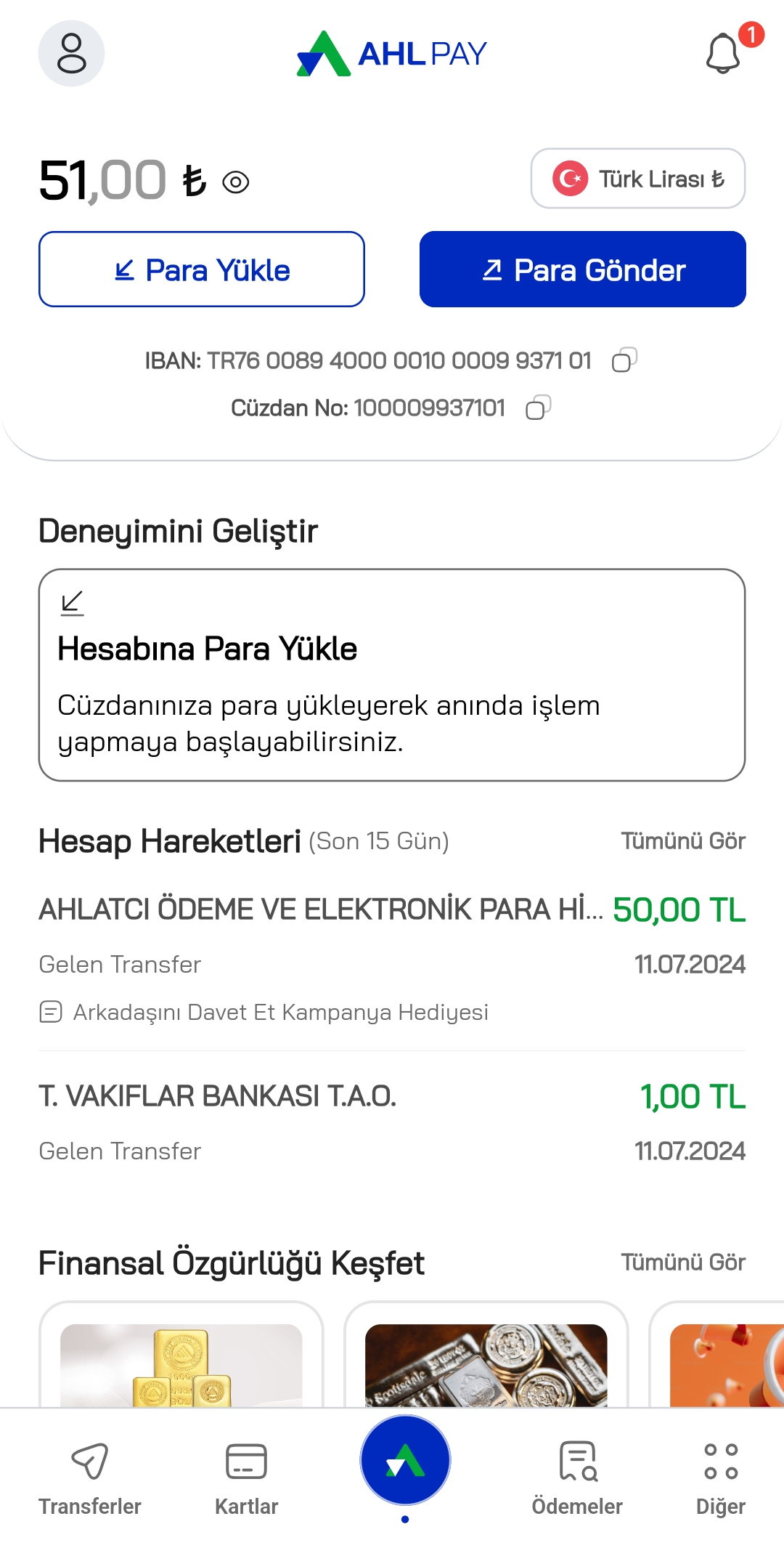 3-) Kendine ait bir bankadan 1 TL yükleme yap en geç 15 dakika içinde bakiye düşüyor.