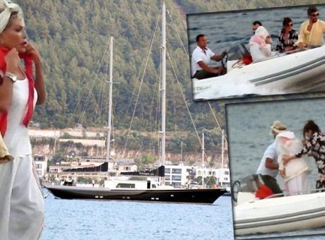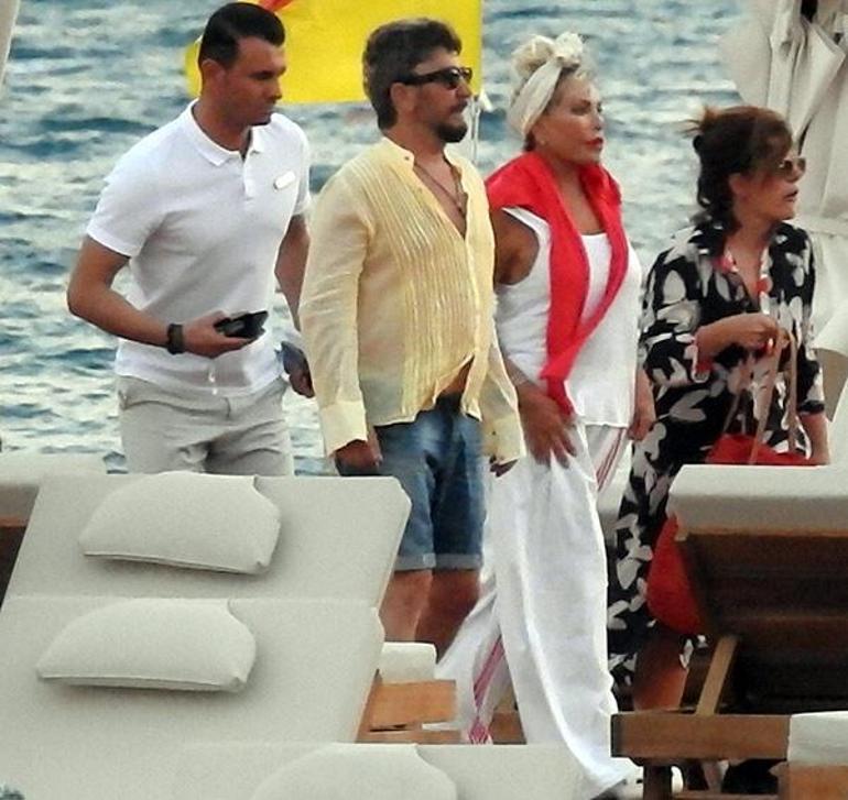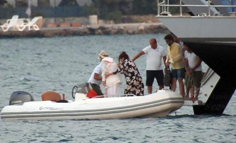 Otel çalışanları, iskeleye yanaşan bottan inmekte zorluk yaşayan Ajda Pekkan'a yardımcı oldu.