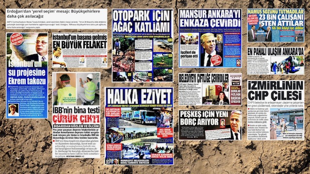 Son 20 gün içinde Akşam, Sabah, Yeni Şafak ve Yeni Akit gazetelerinin birinci sayfalarında yayımlanan çoğu İstanbul, Ankara ve İzmir olmak üzere CHP’li belediyelere yönelik olumsuzluk içeren haberlerinin başlıklardan bazı örnekler: