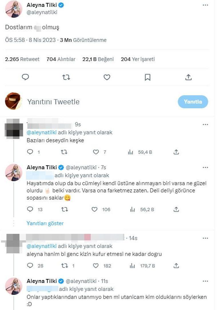 Aleyna Tilki'nin küfürlü paylaşımını gören takipçileri, "Bir genç kızın küfür etmesi doğru değil" yorumlarını yaparken oldukça sinirli olduğu gözlenen Tilki, "Onlar yaptıklarından utanmıyor, ben mi utanacağım kim olduklarını söylerken" cevabını verdi. Birçok kişi ünlü şarkıcının kime sinirlendiğini merak ediyor.