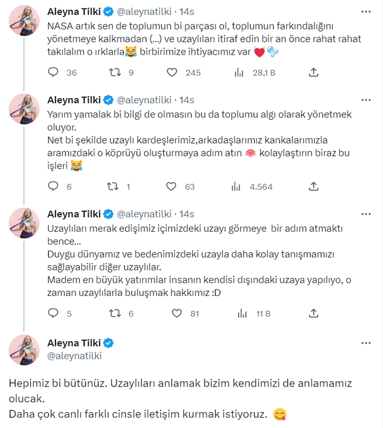 "Uzaylıları merak edişimiz, içimizdeki uzayı görmeye bir adım atmaktı bence..." diyen Tilki, "Duygu dünyamız ve bedenimizdeki uzayla daha kolay tanışmamızı sağlayabilir diğer uzaylılar. Madem en büyük yatırımlar insanın kendisi dışındaki uzaya yapılıyor, o zaman uzaylılarla buluşmak hakkımız" mesajını yazdı ve ekledi: