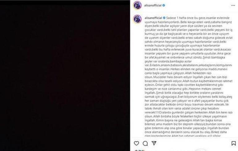 Alişan, daha önce de deprem ile ilgili paylaşım yapmış ve takipçilerine duygu dolu anlar yaşatmıştı. Alişan paylaşımında şunları söylemişti: