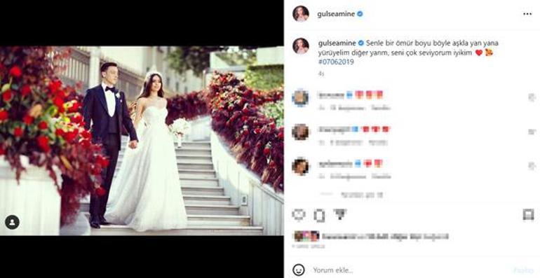 Mesut Özil ile evlendiği günden gelinlikli ve damatlıklı bir karesini paylaşan Gülşe, altına ise ''Seninle bir ömür boyu böyle aşkla yan yana yürüyelim diğer yarım. Seni çok seviyorum iyikim. 07.06.2019'' notunu düştü. Tescilli güzelin eşinin kullanıcı adını kalbine etiketlemesi ise dikkatlerden kaçmadı. Ünlü ismin paylaşımına takipçilerinden binlerce beğeni geldi.