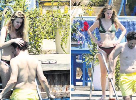 Erken saatlerde deniz ve güneşin tadını çıkaran çift, bir ara iskelenin merdivenlerinde aşka geldi. Karikatürist, oyuncunun göbeğini öperken, objektiflere böyle takıldı. -UMUT ÜNVER