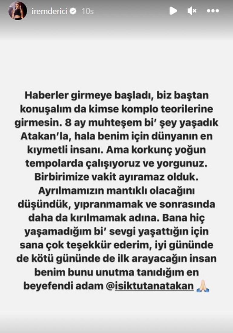 Ancak evlenmesi beklenen çiftten kötü haber geldi. İrem Derici, Atakan Işıktutan ile ayrıldıklarını duyurarak; şu açıklamayı yaptı: