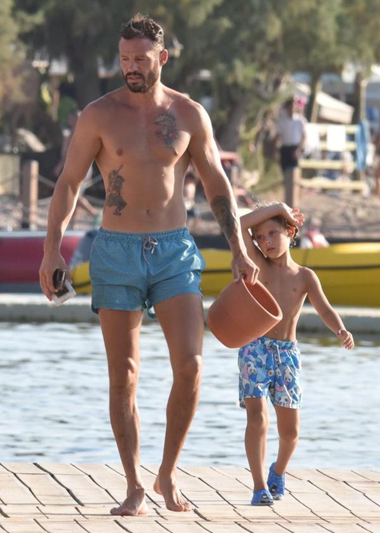 Serap Korkmaz iskelenin ucunda güneşlenirken Atakan Arslan ve oğlu Aslan, birbirleriyle şakalaştı.