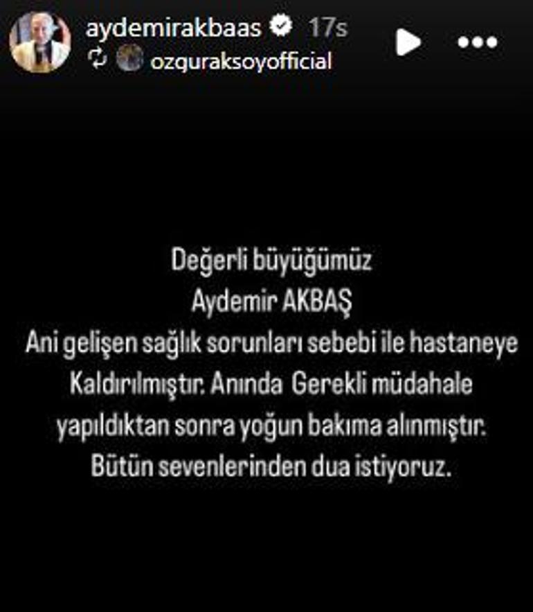 Kanserle mücadele eden Aydemir Akbaş'tan dün üzücü bir haber geldi. Usta sanatçının sosyal medya hesabından yapılan açıklamada, Akbaş'ın yoğun bakıma kaldırıldığı duyuruldu.