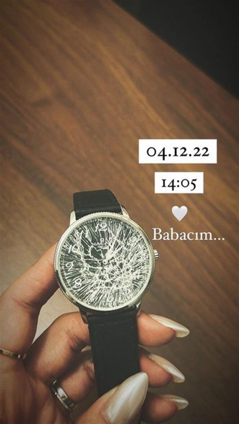 Ünlü manken, Haydar Ulusoy'un kaza anında kolunda bulunan saatin kırık halini sosyal medya hesabından, "04.12.22... 14:05... Babacığım..." mesajıyla paylaşmıştı.