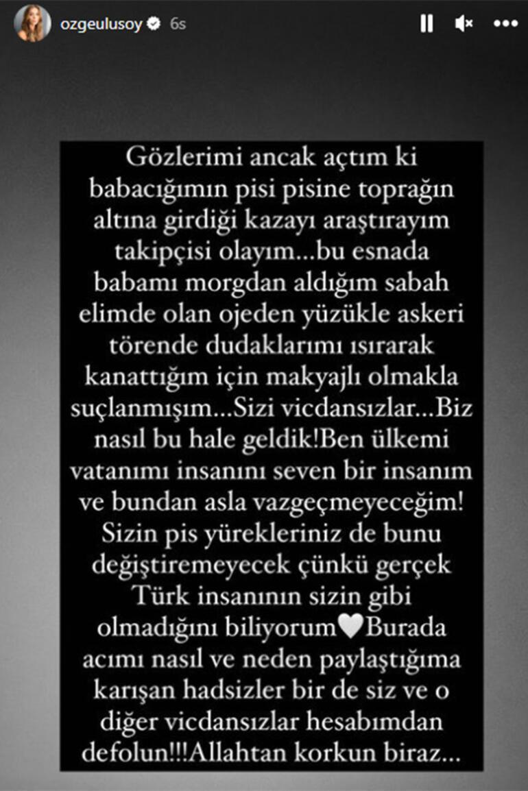 Tarifsiz bir acı yaşayan Özge Ulusoy, babasının cenaze törenine ojeli ve makyajlı şekilde katıldığı yönündeki eleştirilere isyan etmiş ve şunları söylemişti:
