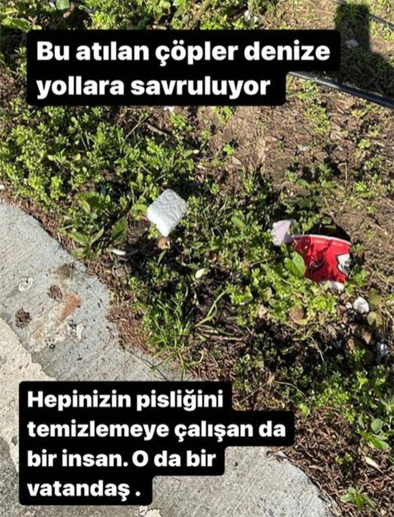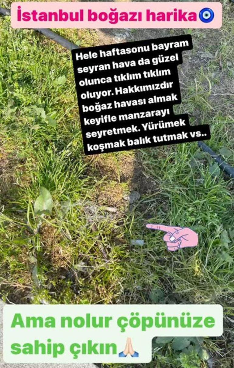 Deniz kenarına bırakılan çöplerin fotoğrafını yayınlayarak, ''İstanbul Boğazı harika. Hafta sonu hava da güzel olunca tıklım tıklım oluyor. Hakkımızdır Boğaz havası almak, keyifle manzarayı seyretmek, yürümek, koşmak, balık tutmak. Ama ne olur çöpünüze sahip çıkın.'' ifadelerini kullandı.