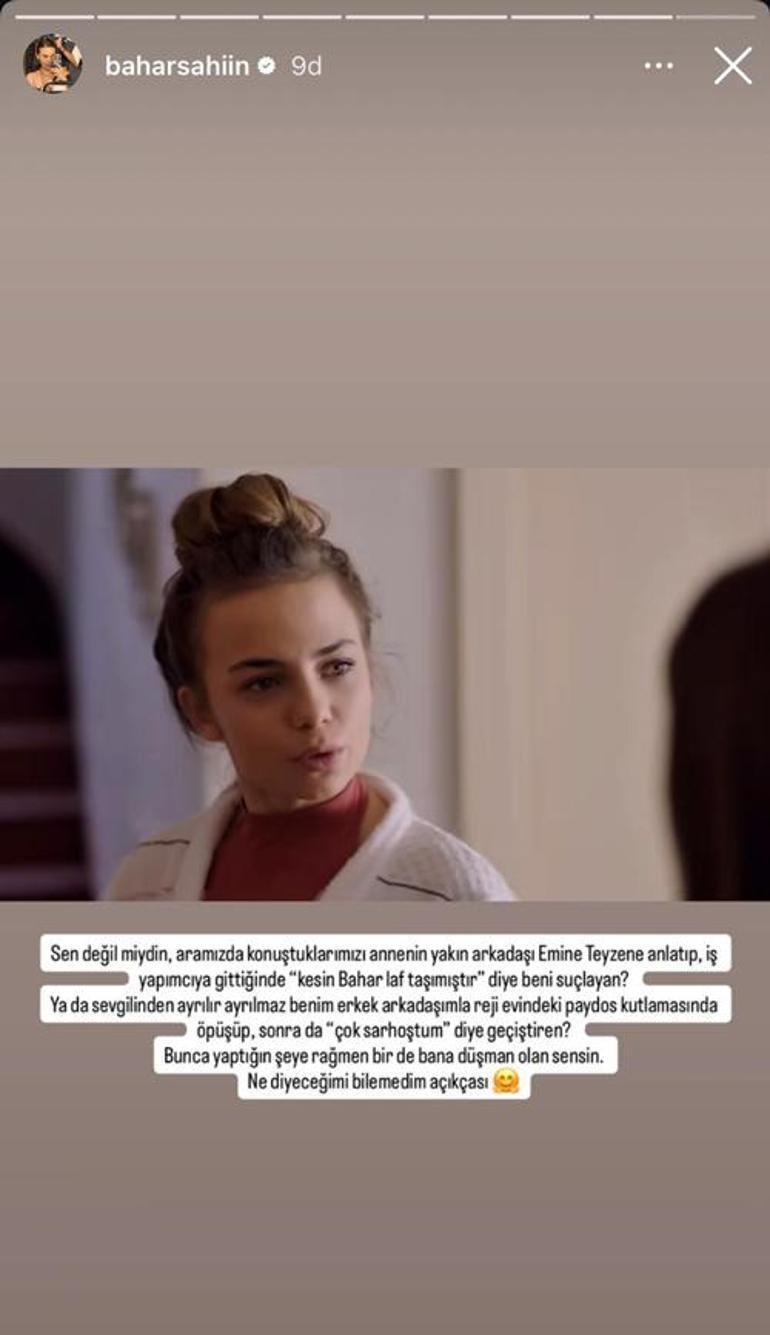 “Sen değil miydin, aramızda konuştuklarımızı annenin yakın arkadaşı Emine Teyze’ye anlatıp; iş yapımcıya gittiğinde, ‘Kesin Bahar laf taşımıştır’ diye beni suçlayan? Ya da sevgilinden ayrılır ayrılmaz, benim erkek arkadaşımla reji evindeki paydos kutlamasında öpüşüp, sonra da ‘çok sarhoştum’ diyerek geçiştiren? Bunca yaptığın şeye rağmen bir de bana düşman olan sensin. Ne diyeceğimi bilemedim açıkçası.”