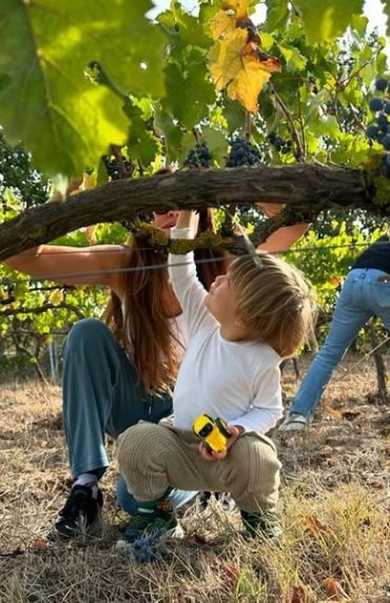 Minik parmaklarıyla anne ve babasına yardım eden Kurt Efe de üzüm topladı. Başak Dizer, o anları sosyal medya hesabından: 'Kahramanın yolculuğu. Ve kahramanımın doğum günü' notuyla yayınladı.