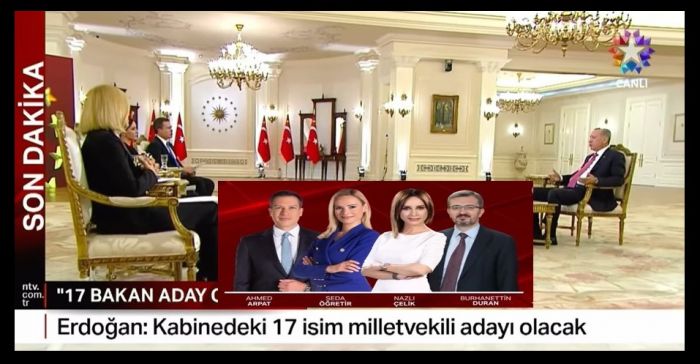 • NTV-Star ortak yayınında Seda Öğretir, Ahmed Arpat ve Nazlı Çelik’in yanı sıra iktidarın yan kuruluşlarından SETA’nın Genel Koordinatörü olan ve Sabah’ta yazan Burhanettin Duran da gazeteci gibi “soru” sorması için Cumhurbaşkanı Erdoğan’ın karşısına çıkarıldı.
