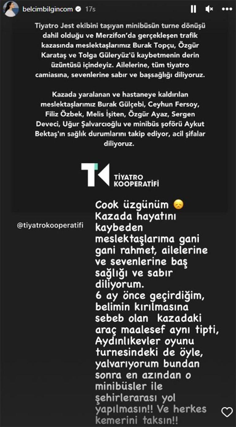 Çorum'da önceki gün 'Baş Belası' adlı tiyatro oyununu sahnelemelerinin ardından Samsun’a doğru hareket eden oyuncuları taşıyan minibüs, önünde seyreden TIR'a arkadan çarptı. Minibüste sıkışan Tolga Güleryüz, Burak Topçu ve Özgür Karataş kaza yerinde hayatını kaybetti. Belçim Bilgin, feci kaza hakkında dikkat çeken bir paylaşım yaptı.