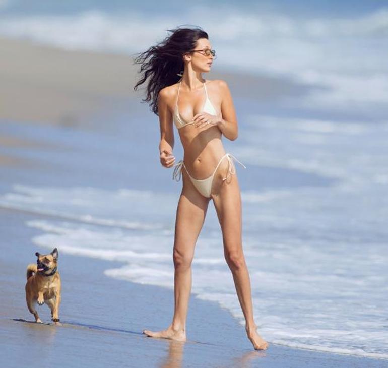 İpli, beyaz bikinisini kahverengi güneş gözlükleriyle tamamlayan Bella Hadid, yoğun programına ara verip tatile çıkmanın mutluluğunu yaşadı.