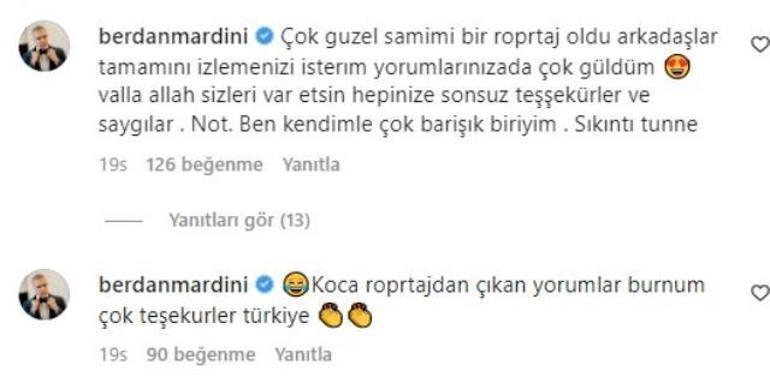 Hakkındaki yorumlara sessiz kalamayan Mardini ise "Çok güzel, samimi bir röportaj oldu arkadaşlar. Tamamını izlemenizi isterim, yorumlarına çok güldüm. Valla Allah sizleri var etsin, hepinize sonsuz teşekkürler ve saygılar. Ben kendimle barışık biriyim. Sıkıntı yok. Koca röportajdan çıkan yorumlar burnum. Çok teşekkürler Türkiye" dedi.