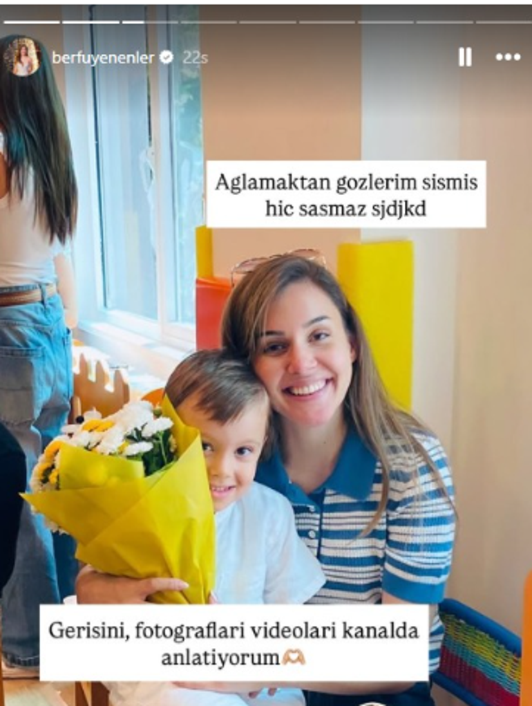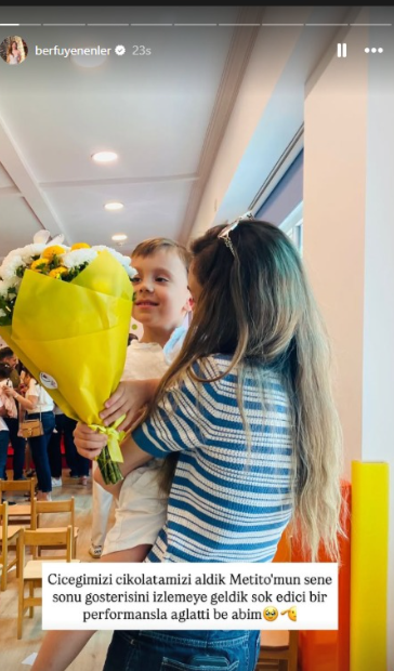Berfu Yenenler o duygu dolu anları Instagram hesabında, "Çiçeğimizi çikolatamızı aldık Memito'mun sene sonu gösterisini izlemeye geldik şok edici bir performansla ağlattı abim" notuyla paylaştı.