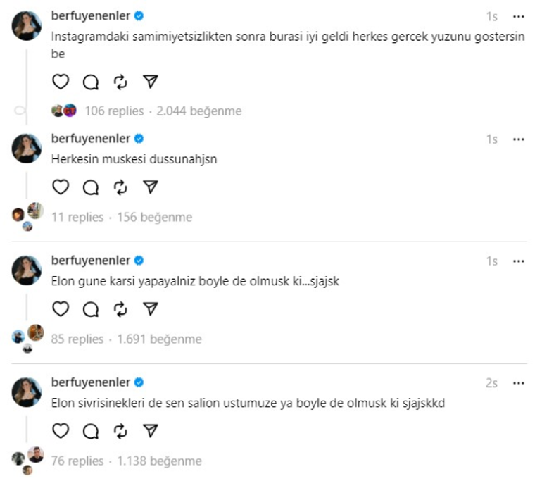 Eşinin uygulamada peş peşe yaptığı paylaşımlar Eser Yenenler'i rahatsız etti. Berfu Yenenler'e tepki gösteren ünlü oyuncu, "Ben bir anlık heves sandım. Threads'da böyle bir tip mi olacaksın sen?" ifadelerini kullandı.