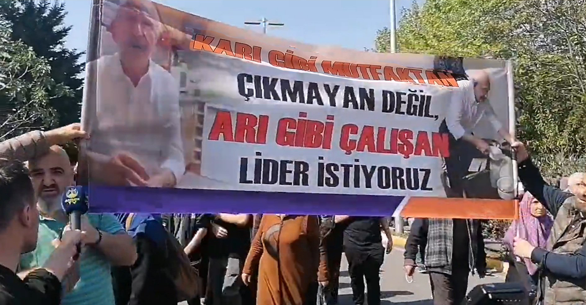 Pankartta, “Karı gibi mutfaktan çıkmayan değil, arı gibi çalışan lider istiyoruz” gibi iğrenç bir ifade yer alıyordu.