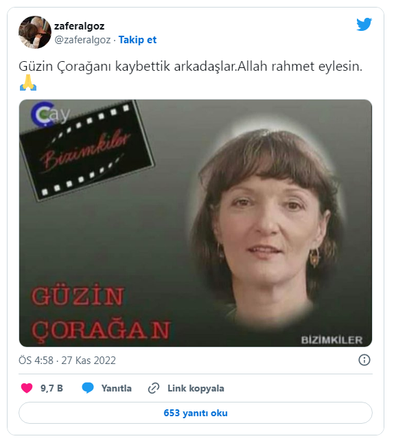 Bizimkiler dizisinin Ulviye'si Güzin Çorağan, 79 yaşında hayata özlerini yumdu. Oyuncunun vefat haberini Zafer Algöz duyurdu.