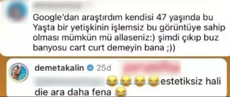 Demet Akalın da ünlü ismin bu açıklamalarına kayıtsız kalamayarak; "Google'dan araştırdım kendisi 47 yaşında, bu yaşta bir yetişkinin işlem yaptırmadan böyle bir görüntüye sahip olması mümkün mü?" yorumunu yapan bir sosyal medya kullanıcısına yanıt verdi.