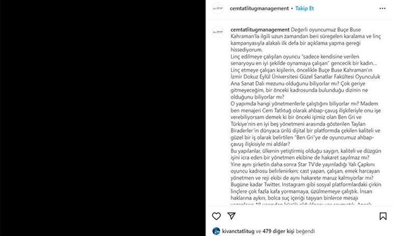 Son olarak Buçe Kahraman'ın Instagram hesabında paylaştığı son pozuna takipçilerinden kötü yorumlar gelmeye devam etti. Oyuncusunu itibar suikastine uğradığını söyleyen menajer Cem Tatlıtuğ, yaptığı yazılı açıklamada şu ifadeleri kullandı: