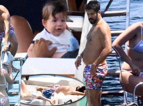 Eşinin ardından teknenin arka kısmından kendisini serin sulara bırakan Burak Özçivit’in göbekli hali objektiflere böyle yansıdı.