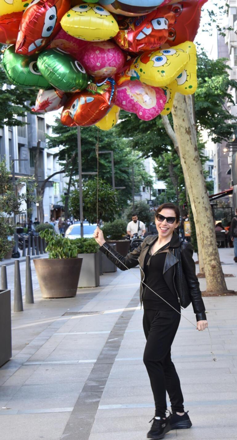 47 yaşındaki Burcu Güneş, ardından cadde üstündeki uçan balonları görünce dayanamayıp; "Uçan balonlar benim en sevdiklerimden" dedi ve muhabirlere poz vermişti.