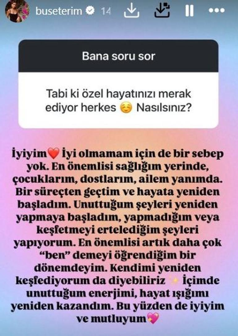 Buse Terim ayrılığın ardından ilk kez sosyal medya hesabından takipçileriyle soru - cevap etkinliği yaptı. Ünlü isim, kendisine gelen 'boşanma' sorularına yanıt verdi.