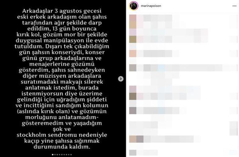 "Paylaşacağım fotoğraflar şahsın bana farklı zamanlarda uyguladığı şiddetlerden. Yaşadığım olay bir kez olmuş bir olay değil, altı ay boyunca sistematik bir şekilde maruz kaldım. Şahsın ilk şiddetinde değişebileceğine inanıp terapiye gönderdim ve bu ilişkiye devam ettim. 14 Ağustos gecesi barda yanından kaçıp arkadaşlarımın yanına gittim. Ve ancak 15 gün sonra hastane ve karakola gidebildim. Suç olduğu için şahsın kendisinin bu şiddeti kabul ettiği ve benim ilişkide toksik olmadığımı kanıtlayan, şahsa altı aydır şiddet uygulayanın ben olmadığımı kanıtlayan konuşmalarımızı buraya koyamıyorum."