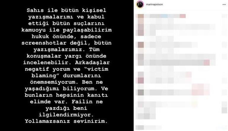 Tunaboylu'nun bu açıklaması üzerine bir mesaj daha yayınlayan Çelik, "Şahıs ile bütün kişisel yazışmalarımı ve kabul ettiği bütün suçlarını kamuoyu bile paylaşabilirim hukuk önünde. Sadece ekran görüntüleri değil, bütün yazışmalarımız. Tüm konuşmalar yargı önünde incelenebilir. Arkadaşlar negatif yorumları önemsemiyorum. Ben ne yaşadığımı biliyorum ve bunların hepsinin kanıtı elimde var. Failin ne yazdığı beni ilgilendirmiyor" dedi.