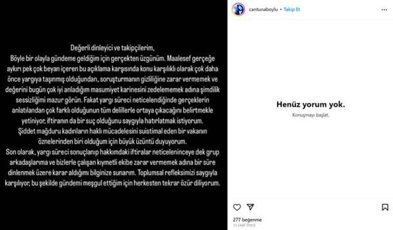 "Şiddet mağduru kadınların haklı mücadelesini suistimal eden bir vakanın öznelerinden biri olduğum için büyük üzüntü duyuyorum. Son olarak, yargı süreci yargı süreci sonuçlanıp hakkımdaki iddialar neticeleninceye dek grup arkadaşlarıma ve bizlerle çalışan çok kıymetli ekibe zarar vermemek adına bir süre dinlenmek üzere karar aldığımı bilginize sunarım. Toplumsal refleksimizi saygıyla karşılıyor, bu şekilde gündemi meşgul ettiğim için herkesten tekrar özür diliyorum."
