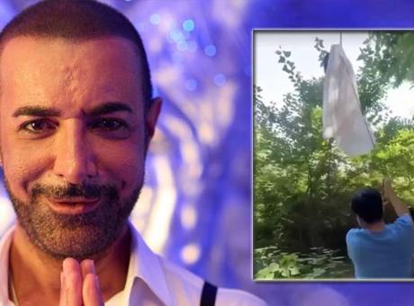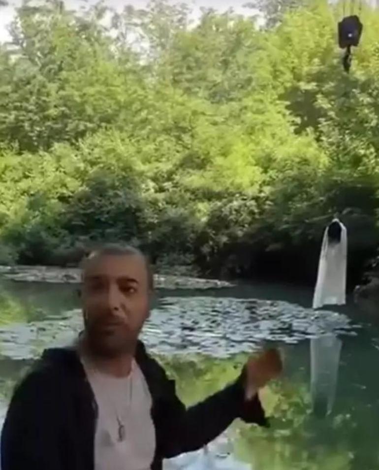 Beyaz elbise giyerek vinçle havaya kaldırılan Özbek sanatçı bir süre sonra seslere tepki vermedi.