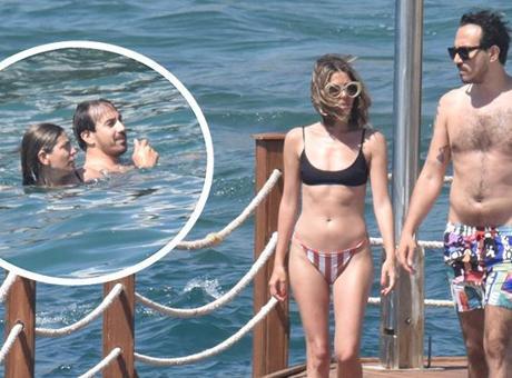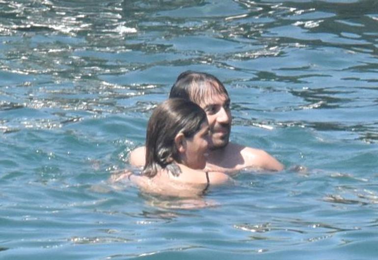 Ünlü çift iskelenin sonuna gelerek bir süre denizi izledi. Önce Ceren Moray ardından sevgilisi Doğu Orcan merdivenlerden inerek denize girdi.