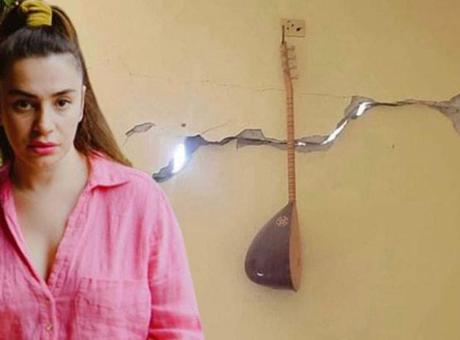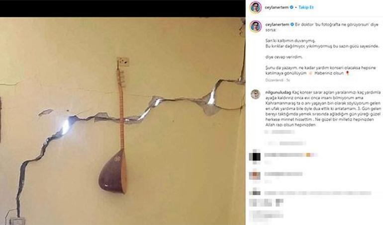 Ceylan Ertem, binlerce kişinin hayatını kaybettiği, 11 ilimizde yıkıma yol açan deprem felaketi sonrası hasarlı bir evin duvarında asılı olan bağlamanın fotoğrafını sosyal medya hesabından paylaştı.
