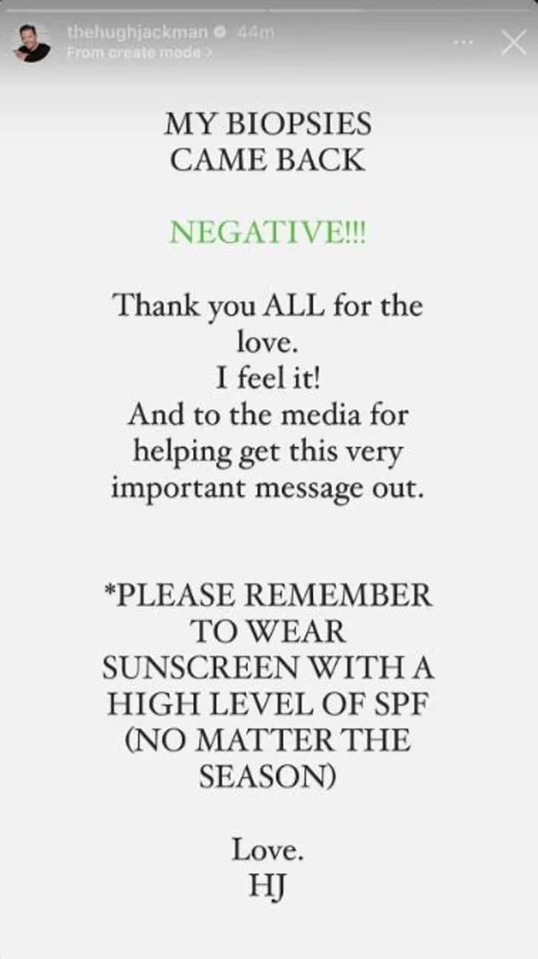 Ünlü isim, son olarak biyopsi sonuçlarını hayranlarıyla paylaştı. Cilt kanseri için yapılan testlerin negatif çıktığını Instagram sayfasının hikayeler bölümünden yayınladığı bir yazı ile duyuran Jackman, şu ifadeleri kullandı: