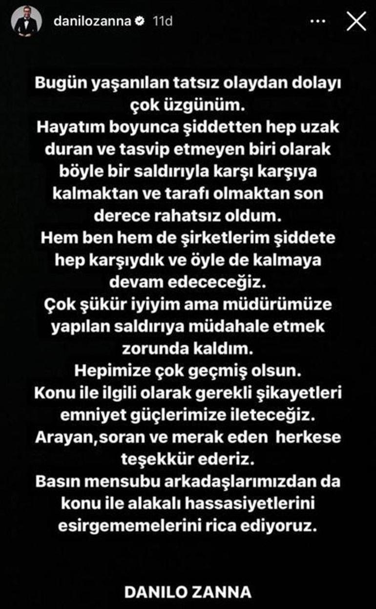 Sosyal medya hesabı üzerinden açıklama yapan Danilo Zanna, "Tatsız olaydan dolayı çok üzgünüm. Hayatım boyunca şiddetten hep uzak duran ve tasvip etmeyen biri olarak böyle bir saldırıyla karşı karşıya kalmaktan ve tarafı olmaktan son derece rahatsız oldum. Hem ben, hem de şirketlerim şiddete hep karşıydık ve öyle de kalmaya devam edeceğiz. Çok şükür iyiyim ama müdürümüze yapılan saldırıya müdahale etmek zorunda kaldım. Hepimize çok geçmiş olsun. Konu ile ilgili olarak gerekli şikayetleri emniyet güçlerimize ileteceğiz. Arayan, soran ve merak eden herkese teşekkürler" ifadelerini kullandı.