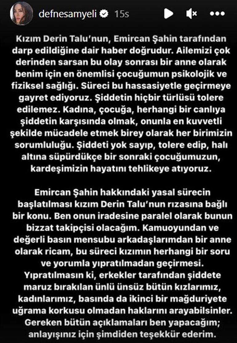 Basına yansıyan haberlerin ardından konuya ilişkin Instagram hesabınan paylaşım yapan şarkıcı,''Kızım Derin Talu'nun, Emircan Şahin tarafından darp edildiğine dair haberler doğrudur. Ailemizi çok derinden sarsan bu olay sonrası bir anne olarak benim için en önemlisi çocuğumun psikolojik ve fiziksel sağlığı. Süreci bu hassasiyetle geçirmeye gayret ediyoruz. Şiddetin her türlüsü tolere edilemez. Kadına, çocuğa, herhangi bir canlıya şiddetin karşısında olmak, onunla en kuvvetli şekilde mücadele etmek birey olarak her birimizin sorumluluğu. Şiddeti yok sayıp, tolere edip, halı altına süpürdükçe bir sonraki çocuğumuzun, kardeşimizin hayatını tehlikeye atıyoruz" ifadelerini kullandı.