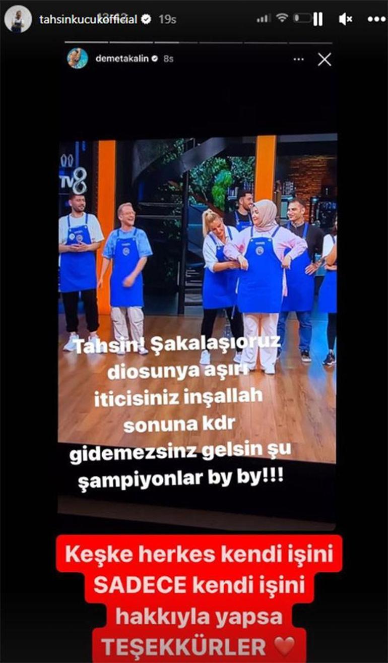 Konserleri dışında MasterChef programnını hiç kaçırmayan Demet Akalın, "Tahsin 'şakalaşıyoruz' diyorsun. Aşırı iticisiniz. İnşallah sonuna kadar gidemezsiniz. Gelsin şu şampiyonalr bye bye" mesajını yazdı. Tahsin Küçük, şarkıcının paylaşımına sessiz kalmadı.