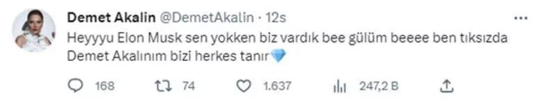 Twitter'de 6.7 milyon takipçisi bulunan şarkıcı Demet Akalın, bu duruma tepki göstererek; "Heyyyu Elon Musk, sen yokken biz vardık be gülüm. Ben tıksız da Demet Akalın'ım, bizi herkes tanır" mesajını paylaşmıştı.