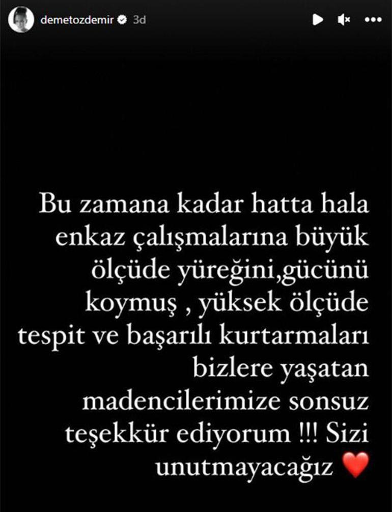 Adıyaman dışındaki afet bölgelerinde de arama kurtarma çalışmalarındaki önemli katkılarıyla alkış alan madenciler herkesin takdirini kazandı. Oyuncu Demet Özdemir de sosyal medya paylaşımı ile maden işçilerine teşekkür etti.