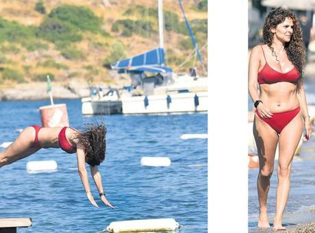 Kırmızı bikinisi ve fit görünümüyle dikkat çeken oyuncu, iskeleden denize balıklama atlayarak, serin suların keyfini çıkardı. Topuz, yaklaşık yarım saat yüzdükten sonra dinlenmeye çekildi. / TOLGA BOZDUMAN