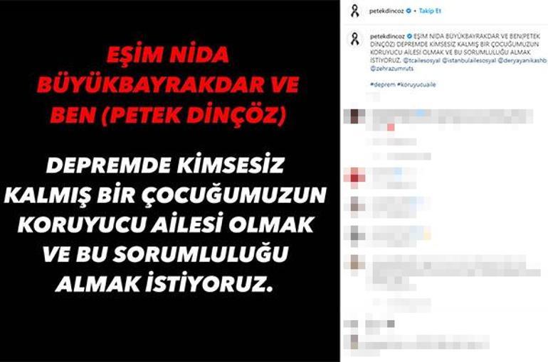 Ağustos 2022'de çocukluk aşkı, iş insanı Nida Büyükbayraktar ile dünyaevine giren Petek Dinçöz, Instagram hesabından "Eşim Nida Büyükbayraktar ve ben depremde kimsesiz kalmış bir çocuğumuzun koruyucu ailesi olmak ve bu sorumluluğu almak istiyoruz" açıklamasını yaptı.